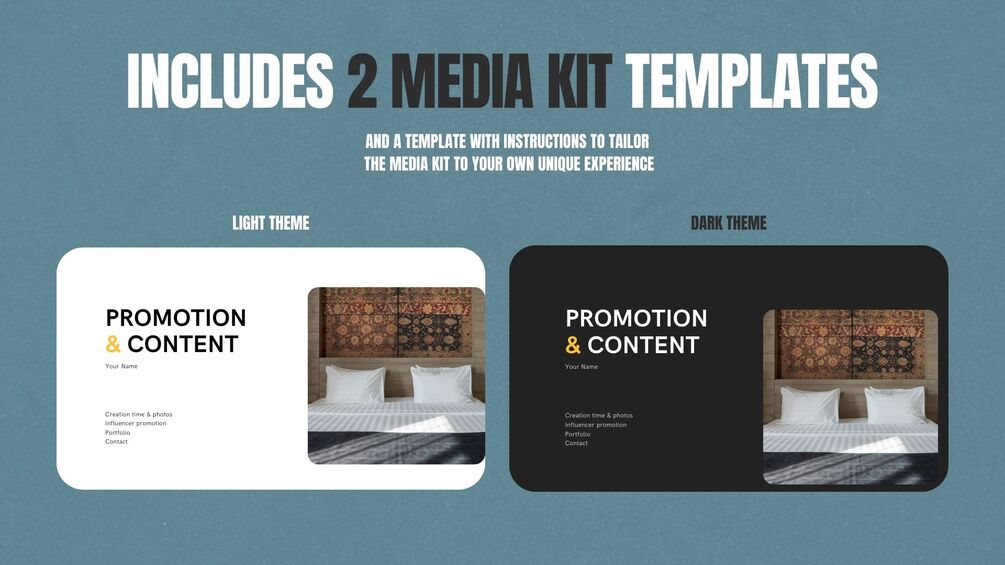 • 2 Media Kit Templates: Available in both bright and dark themes, you'll have an extra template with instructions on how to tailor your pitch to your specific experience.